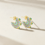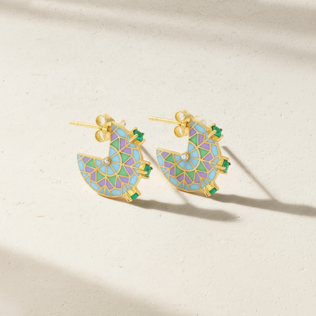 These stylish earrings combine green, lavender, and blue enamel with emeralds and white diamonds, making them a versatile choice for both day and evening wear. The unique pattern and mix of colors add a lively yet sophisticated touch to any outfit.