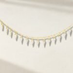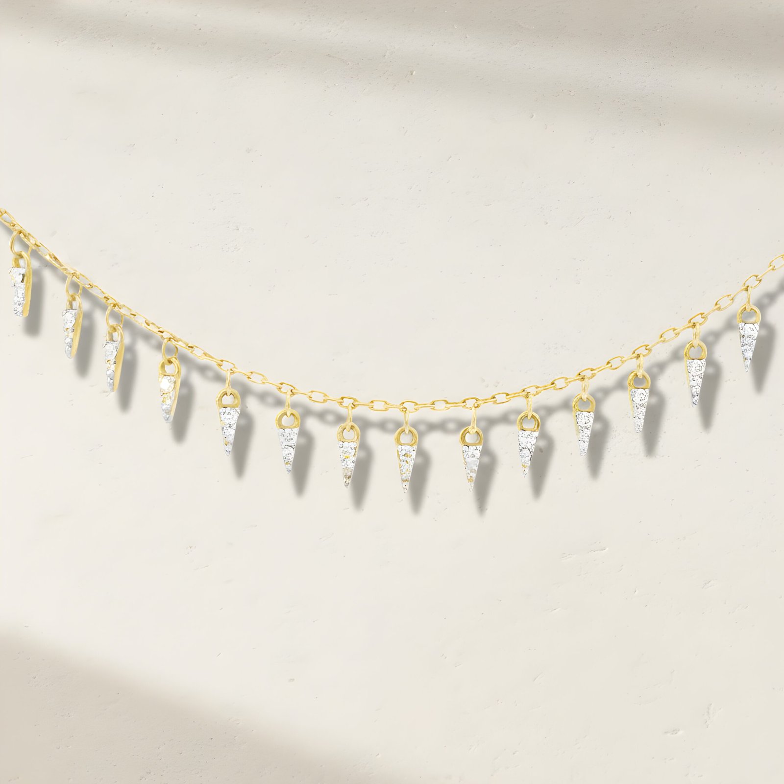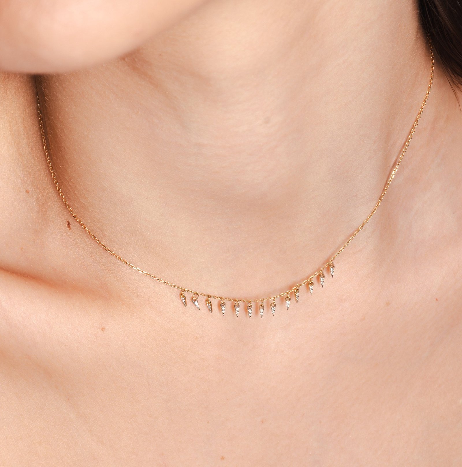 This classic yellow gold necklace is adorned with 0.11 carats of white diamonds, featuring a sequence of diamond drop spikes. It’s the ultimate chic necklace that can be easily layered with other pieces for a chic, stylish look.
