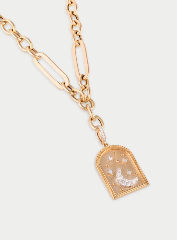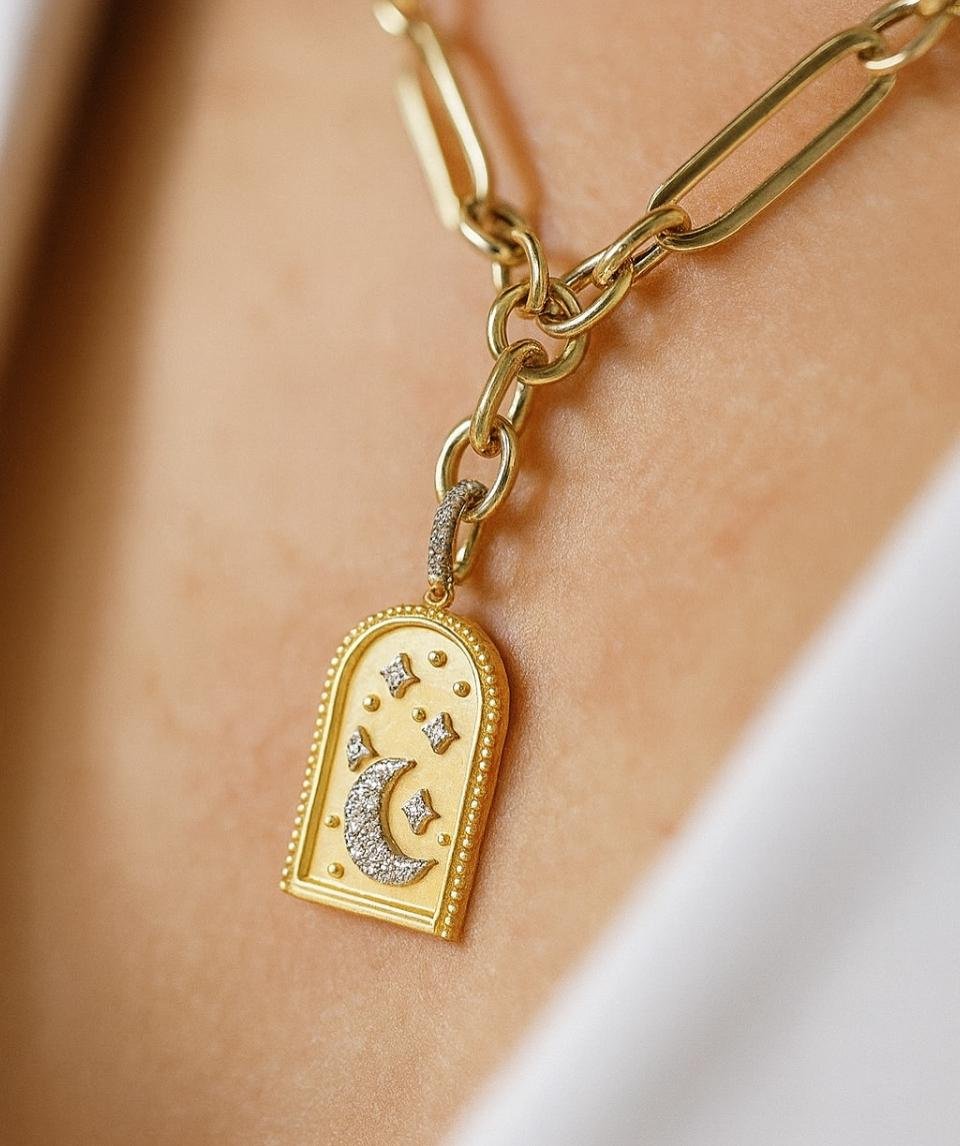 The Midnight Sky Necklace features a bold yellow gold chain adorned with a moon and star motif, accented by sparkling white diamonds. A striking design that brings a touch of night-sky magic to any look.