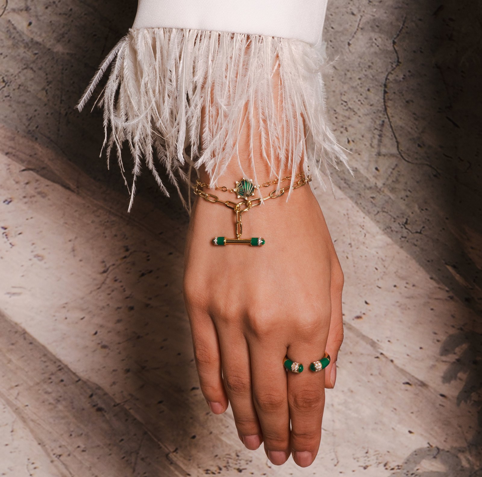 Yellow gold bracelet with White diamonds, emeralds, and malachite