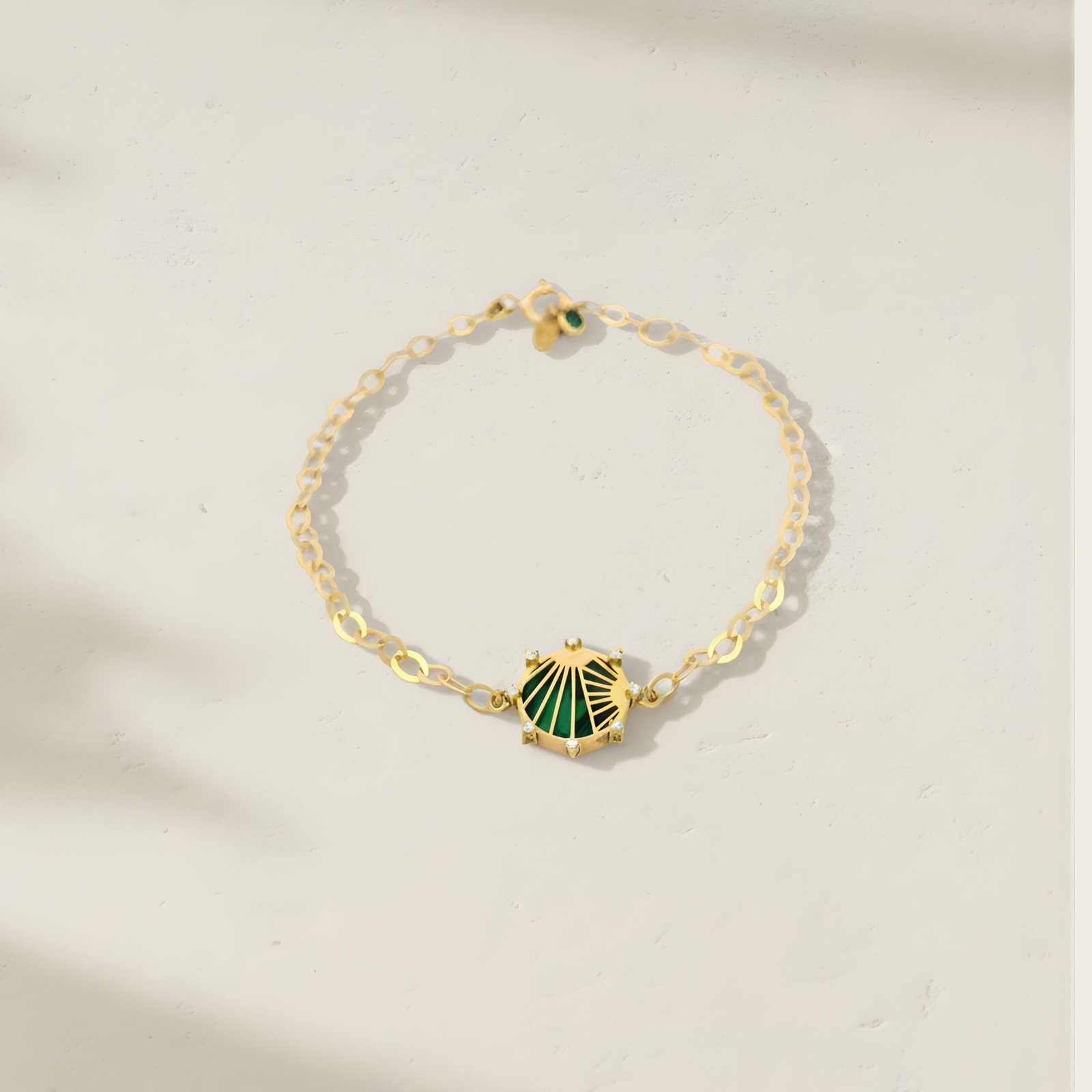 This yellow gold bracelet offers a touch of understated elegance, featuring a striking malachite charm, adorned by 0.04 carats of delicate white diamonds with a touch of 0.08 carats of emerald.