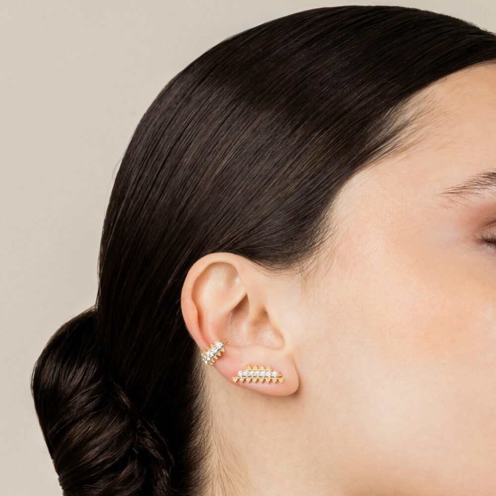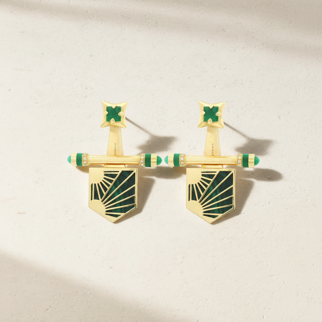 These earrings showcase a detachable design, handcrafted in 18ct yellow gold, accented with 0.09 carats of white diamonds, 0.68 carats of emeralds, and malachite details, all complemented by enamel accents.