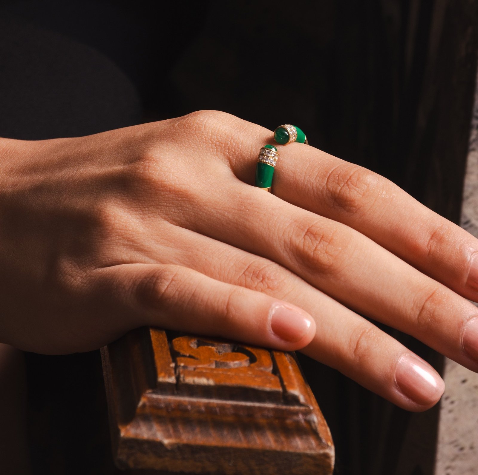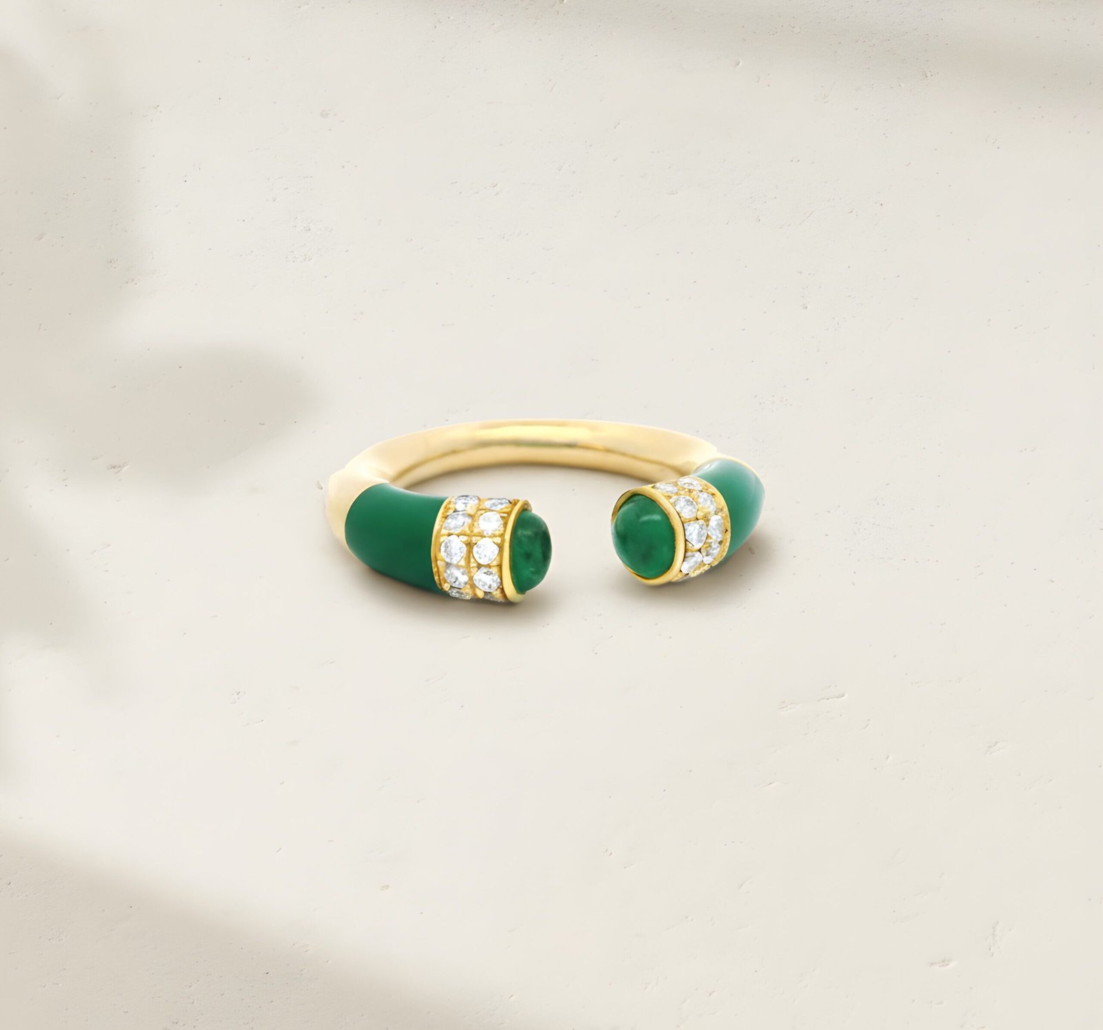 This stunning yellow gold ring showcases an elegant open design, crafted with white diamonds totaling 0.45 carats and emeralds weighing 0.58 carats, embellished with enamel accents.