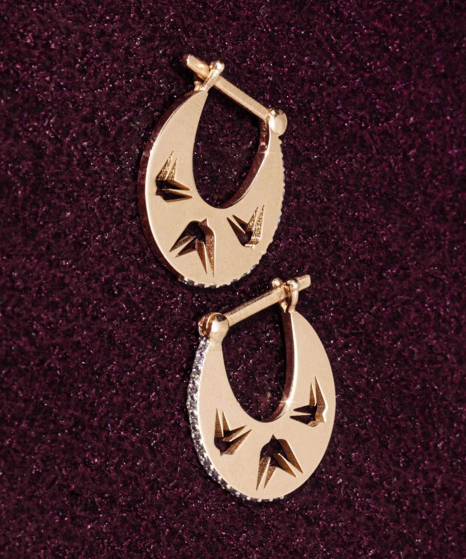 Gold earrings with swallow cutouts and diamond borders. So light you’ll forget they’re there. Until you remember why you’re wearing them.