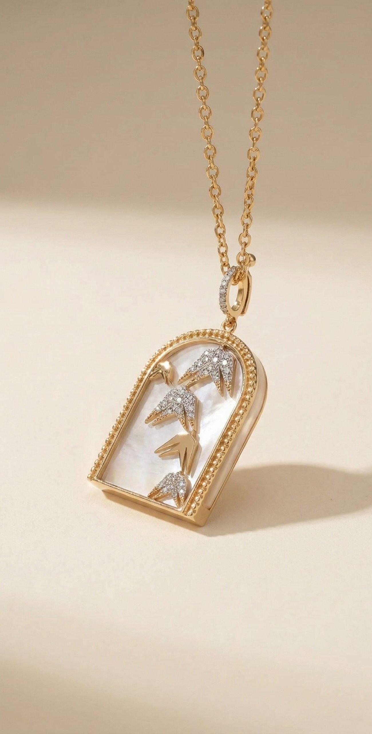 Named for the Greek god of wind, this pendant features engraved swallow birds on luminous mother of pearl, framed by pavé diamonds and gold.